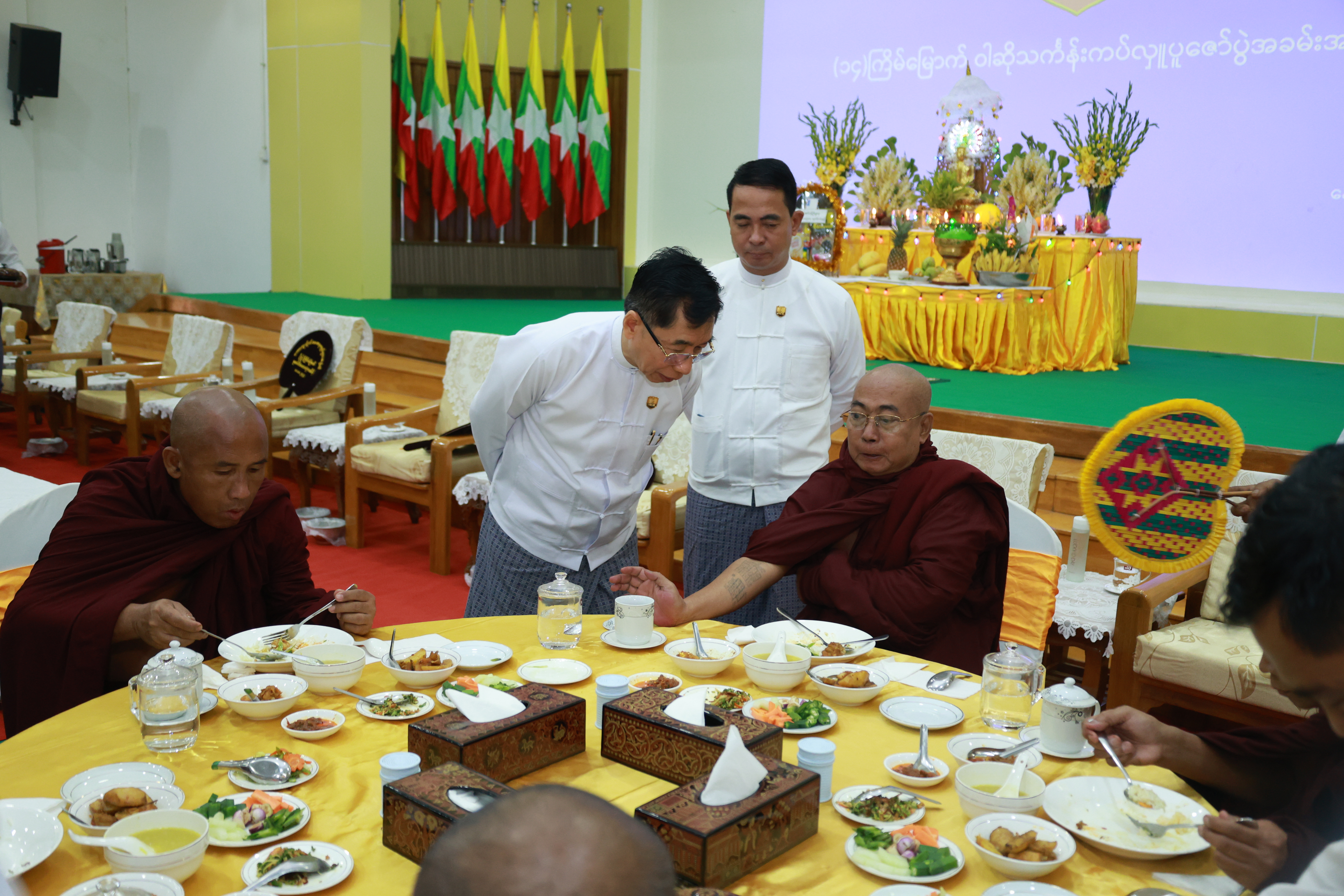 အခမ်းအနားအပြီးတွင် ကြွရောက်လာသော ဆရာတော်၊ သံဃာတော်ကြီးများအား ပြည်ထောင်စုဝန်ကြီးနှင့်ဇနီးအမှူးပြုသော ဝန်ထမ်းမိသားစုများက နေ့ဆွမ်းဆက်ကပ်လှူဒါန်းခဲ့ကြောင်း သတင်းရရှိပါသည်။
