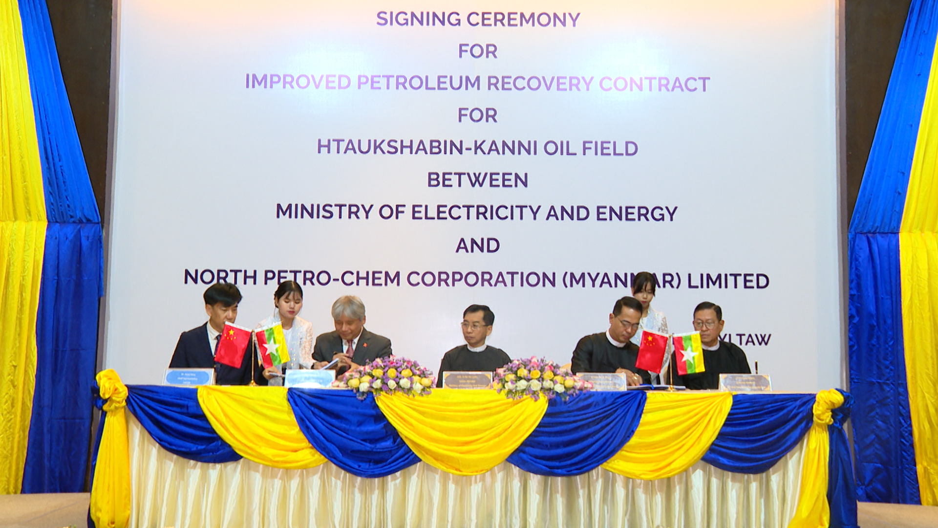 ၂၀၂၆ ခုနှစ်၊ ဧပြီလ ၁၀ ရက်နေ့တွင် နေပြည်တော် Park Royal Hotel ၌ လျှပ်စစ် နှင့်စွမ်းအင်ဝန်ကြီးဌာနနှင့် North Petro-Chem Corporation (Myanmar) Limited တို့အကြား ထောက်ရှာပင်-ကမ်းနီရေနံမြေတွင် ရေနံတိုးမြှင့်ထုတ်လုပ်ရန်အတွက် ရေနံတိုးတက်ထုတ်ယူရေး စာချုပ် လက်မှတ်ရေးထိုးပွဲအခမ်းအနားကျင်းပပြုလုပ်ခဲ့ရာ ပြည်ထောင်စုဝန်ကြီး၊ ဒုတိယဝန်ကြီး များ၊ အမြဲတမ်းအတွင်းဝန်၊ ညွှန်ကြားရေးမှူးချုပ်များ၊ ဦးဆောင်ညွှန်ကြားရေးမှူးများနှင့် ကုမ္ပဏီမှ တာဝန်ရှိသူများ တက်ရောက်ခဲ့ကြပါသည်။
