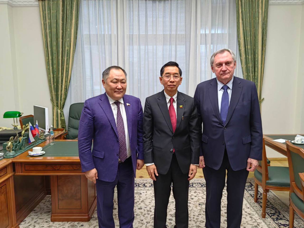ညနေပိုင်းတွင် မြန်မာကိုယ်စားလှယ်အဖွဲ့အား ရုရှားဖက်ဒရေးရှင်းနိုင်ငံ ဒူးမားလွှတ်တော် ဒုတိယဥက္ကဌ H.E. Mr.Sholban KARA-OOL က လက်ခံတွေ့ဆုံရာတွင် မြန်မာနိုင်ငံနှင့် ရုရှား နိုင်ငံတို့ အကြား လျှပ်စစ်နှင့် စွမ်းအင်ကဏ္ဍတွင် ပူးပေါင်းဆောင်ရွက်မှုများ တိုးမြှင့် ဆောင်ရွက် သွားလို သည့် ကိစ္စရပ်များ၊ မြန်မာနိုင်ငံအတွက် လိုအပ်သည့် ရေနံစိမ်းနှင့် ရေနံထွက်ပစ္စည်း များအား ရုရှားနိုင်ငံမှ ရေရှည် သဘောတူညီချက်ဖြင့် ဝယ်ယူနိုင်ရေးအတွက် ခိုင်မာသည့် ထောက်ပံ့ရေးလမ်းကြောင်း တစ်ခု တည်ဆောက်သွားလိုသည့် ကိစ္စရပ်များ၊ အရင်းအနှီးကြီးမားသည့် စီမံကိန်း များအတွက် ရုရှား နိုင်ငံမှ အထူးသက်သာသော အတိုးနှုန်းထားဖြင့် ချေးငွေများ ရယူဆောင်ရွက်နိုင်ပါက စီမံကိန်းလုပ်ငန်းများအား ပိုမိုမြန်ဆန်စွာဆောင်ရွက်သွားနိုင်မည့် အခြေအနေတို့နှင့် ပတ်သက်၍ ဆွေးနွေးခဲ့မှုအပေါ် ဒူမား လွှတ်တော်ဥက္ကဌက မိမိတို့အနေဖြင့် စာချုပ်စာတမ်းများပြုလုပ်ရာတွင် လိုအပ်သည့် ကူညီထောက်ပံ့မှု များ ပြုလုပ်ပေးမည်ဖြစ်ပါကြောင်း၊ ရုရှား နိုင်ငံမှ မြန်မာနိုင်ငံသို့ ရေနံနှင့် ရေနံထွက်ပစ္စည်းများ တင်ပို့ ရောင်းချနိုင်ရေးအတွက် နားလည်မှုစာချွှန်လွှာ (MOU) ရေးထိုးနိုင်ခြင်းသည် အလွန်ကောင်းမွန်သည့် ခြေ လှမ်းတစ်ရပ်ဖြစ်ပြီး ဝမ်းသာဂုဏ်ယူမိပါကြောင်း၊ မိမိတို့အနေဖြင့် နှစ်နိုင်ငံ ချစ်ကြည်ရင်းနှီးမှုကို အခြေခံ ပြီး ဆောင်ရွက်ရန် သက်ဆိုင်ရာအဖွဲ့အစည်းကို မှာကြားထားပြီးဖြစ်ပါကြောင်း၊ အဆွေတော်၏ ဆွေးနွေးမှု များကို နိုင်ငံတော်အကြီး အကဲများထံ တင်ပြပေးမည်ဖြစ်ပါကြောင်း၊ ရုရှားနိုင်ငံ စွမ်းအင်ဝန်ကြီးနှင့် လည်း အမြန်ဆုံး တွေ့ဆုံဆွေးနွေးသွားမည် ဖြစ်ပါကြောင်း၊ ရုရှား-မြန်မာ-တရုတ် သုံးနိုင်ငံစွမ်းအင်ကဏ္ဍတွင် ပူးပေါင်းဆောင်ရွက်သွားနိုင်ရေးသည် အလွန်အရေးကြီးသဖြင့် မိမိတို့ဘက်ကလည်း ကြိုးစား ဆောင် ရွက် သွားမည်ဖြစ်ပါကြောင်း၊ မြန်မာနိုင်ငံဖွံ့ဖြိုးတိုးတက်ရေးနှင့် မြန်မာနိုင်ငံပြည်သူများ အေးချမ်းသာယာရေးအတွက် မိမိတို့ရုရှားနိုင်ငံ အနေဖြင့် လိုအပ်သည့် အကူအညီများ ပေးအပ်ရန် အသင့် ရှိပါကြောင်း ပြော ကြားခဲ့သည်ဟု သတင်း ရရှိပါ သည်။